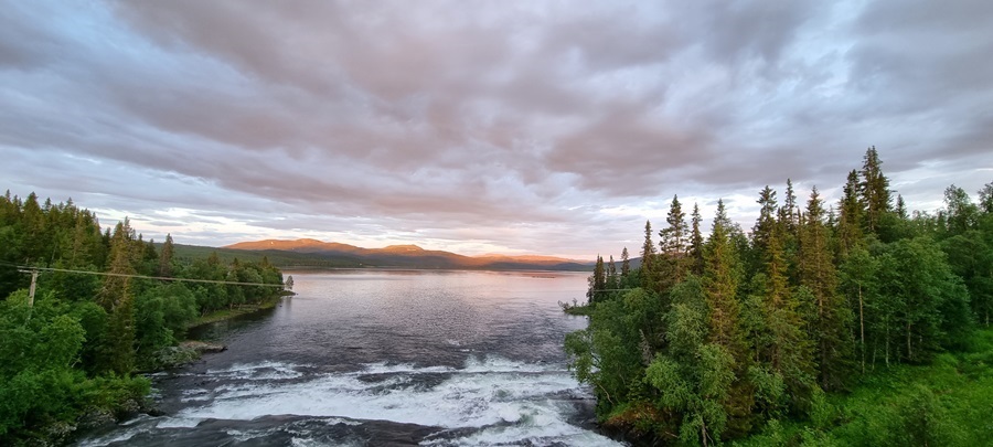 Also ging es recht zeitig weiter, eben etwas einkaufen und dann über die 94 und 374 in Richtung Storforsen-Wasserfall. Hier haben wir ca. 3 km vom Wasserfall entfernt einen echt traumhaften Platz gefunden. Es scheint als wäre man in Kanada. Direkt vor uns der reißende Fluss, umgeben von Kiefern und Birkenwäldern. Wir haben beschlossen zwei Nächte hier zu bleiben und sind heute zum Storforsen gewandert. Unglaublich was für Wassermassen hier den Fluss entlangfließen. Ein kurzes Bad und es ging wieder zurück zum Auto. Jetzt wird noch das Abendessen vorbereitet bevor es Morgen über den Polarkreis nach Jokkmokk geht.